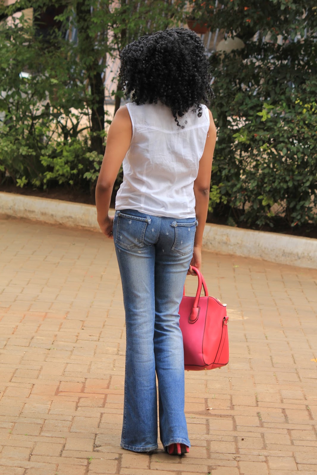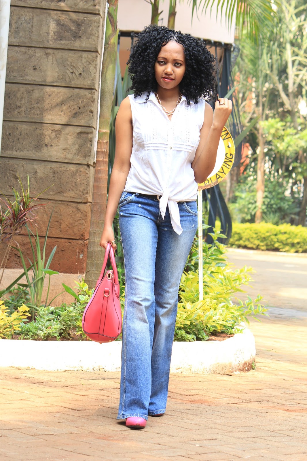 For me mostly its the big hair and ofcourse the flare pants.So here we are today showing you a 70’s inspired look.This is one of those fashion trends that never really fade away.I paired this flare pants with my white sleeveless top and i tied infroint to make it even cooler.I love this pants they fit perfectly and the length is awesome, and they are kinda some distressed detail on top.