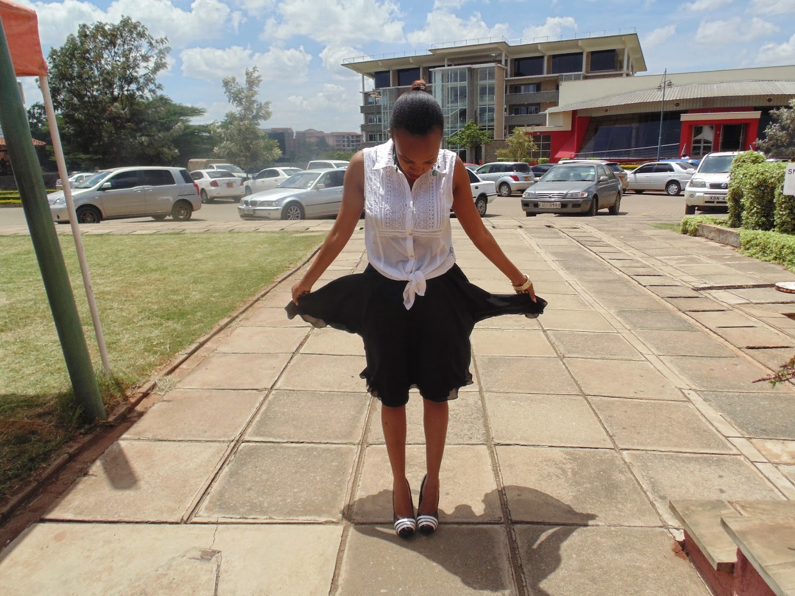 the skirt is just below knees, wore the black and white shoes to finish the look.