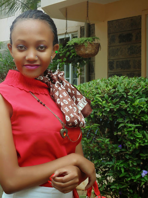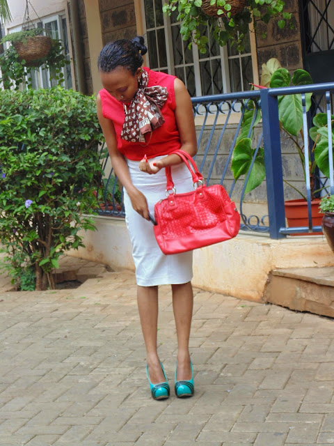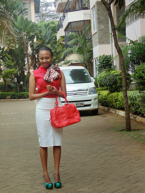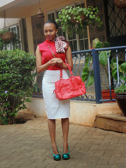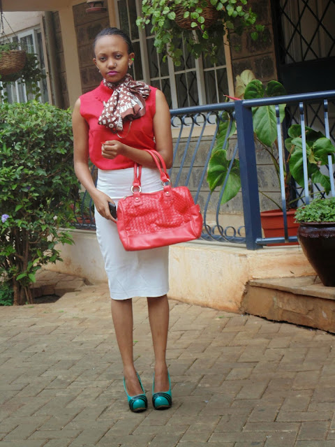 ensemble is a bit sosphticated and very suitable for an office.Playing around with white and red.White pencil skirt ,red bag and red nailpolish.I accessorised with a few necklaces and a scarf.What do you think of this look?Check us on instagram for our daily updates see more