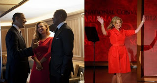 a very low cut neckline showing too much skin contrary to what we are used to seeing her in.