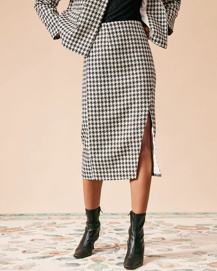 5. High Waisted Plaid Tweed Slit Skirt